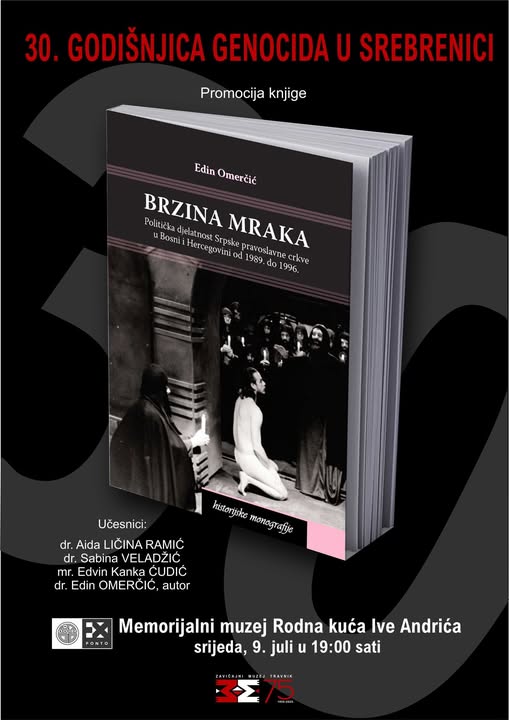 Povodom obilježavanja sjećanja na 30. godišnjicu od počinjenja genocida u Srebrenici Zavičajni muzej Travnik je u srijedu 9. jula priredio promociju knjige “Brzina mraka – Politička djelatnost Srpske pravoslavne crkve u Bosni i Hercegovini od 1989. do 1996.” autora dr. Edina Omerčića sa Instituta za historiju UNSA. Dešavanje je održano u prostoru Ex ponto u okviru Memorijalnog muzeja Rodna kuća Ive Andrića. Prisutnoj publici se najprije obratila direktorica Zavičajnog muzeja Fatima Maslić koja ih je obilježila na značaj datuma povodom kojeg je održana promocija, te zatim predstavila učesnike. Knjigu su promovisali dr. Aida Ličina-Ramić i dr.. Sabina Veladžić sa Instituta za historiju, ustanove koja je istovremeno i izdavač knjige, te, novinar i aktivist za ljudska prava mr. Edvin Kanka Ćudić.