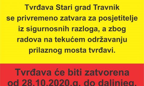 Tvrđava Stari grad Travnik se privremeno zatvara za posjetitelje iz sigurnosnih razloga, a zbog radova na tekućem održavanju prilaznog mosta tvrđavi. Tvrđava će biti zatvorena od 28.10.2020.g. do daljnjeg.