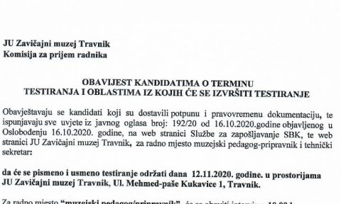 OBAVIJEST KANDIDATIMA O TERMINU TESTIRANJA I OBLASTIMA IZ KOJIH ĆE SE VRŠITI TESTIRANJE