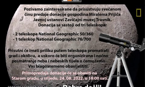 Promatranje grada i okolice teleskopima! Stari grad, srijeda, 24. 08. 2022. u 18:00 sati. Ako ste zainteresovani uključiti se u rad Muzejske astronomske radionice i istraživati nebo i nebeska tijela, možete se prijaviti na telefonski broj 030 518 140. Uskoro počinjemo sa radom.
