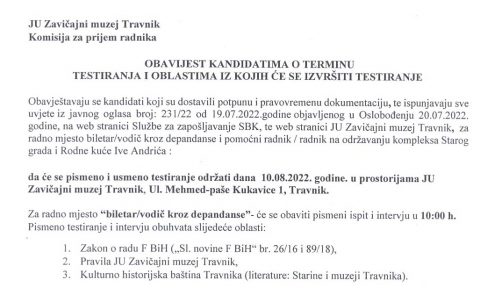 Za radno mjesto “biletar/vodič kroz depandanse”– će se obaviti pismeni ispit i intervju u 10:00 h. Pismeno testiranje i intervju obuhvata slijedeće oblasti: 1. Zakon o radu F BiH („Sl. novine F BiH“ br. 26/16 i 89/18) 2. Pravila JU Zavičajni muzej Travnik 3. Kulturno historijska baština Travnika (literatura: Starine i muzeji Travnika)